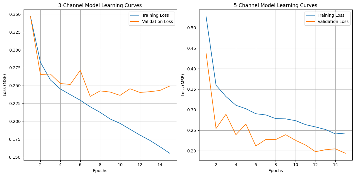 From the learning curves, we find that the validation loss has a significant drop in 5 channel model compared with 3 channel model. The test loss improved 19.25% from 0.241784 to 0.195239.