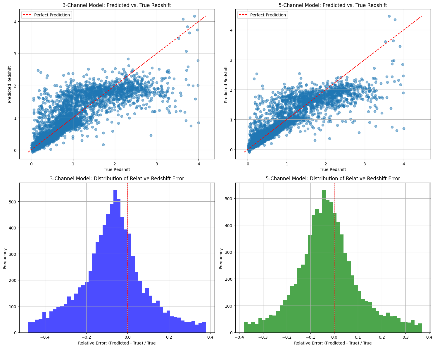 In general, adding more channels does improve the model’s efficiency, this indicates that these extra infrared bands contain important information that can help predict galaxy redshifts.